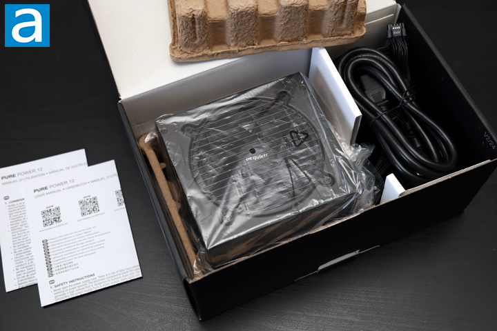 The be quiet! Pure Power 12 1000W's retail package opens with the flap along the bottom. You will find the power supply in a transparent plastic bag and seated in a cardboard shell. A cardboard divider separates the fixed bundle of cables held together with a twist tie. Otherwise, you will also get four screws for mounting your power supply, an AC power cable, some zip ties for cable management, and a product pamphlet.