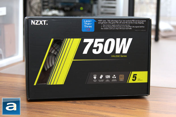 While the color scheme used on the retail package of NZXT's HALE82 750W power supply is quite a bit different than the red and white combination found on the HALE90 series, you can certainly tell the style is from the same manufacturer. A small angled slit on the left shows off the PSU's black grille and white fan through a plastic window; while the big "750W" printing ensures that you will know the wattage of the unit inside without question. But what's particular interesting is the label at the top right corner. Less than three? Yep, NZXT will cover shipping both ways if your power supply is registered with them. I think this is a first from a PSU manufacturer. That's some real love right there.