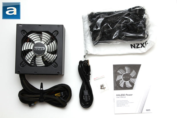 Don't expect a whole lot out of the box; NZXT takes a no-frills approach -- I like that. With everything secured inside, you will get a unit of the HALE82 power supply itself, a bag of modular cables in a disposable clear plastic bag (A reusable drawstring bag is included for future storage, which is a nice touch), AC power cable, four screws, and a manual. All in all, the combination is sweet and simple. To not waste any more of your time, let's jump straight to a closer examination of the exterior of the power supply.