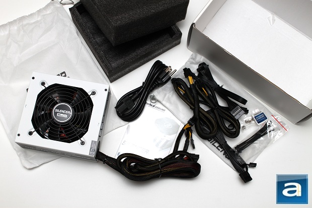 Upon opening the flap, you will find the ghostly white PSU in a ghostly white bag; sandwiched between two foam brackets for extra protection. All the appropriate accessories are provided in a smaller ghostly white bag next to it. You will receive all the necessary modular cables, power cable, several zip ties, four extra screws, and a small manual. In other words, there are no excessive accessories here -- just what you need is provided out of the box.