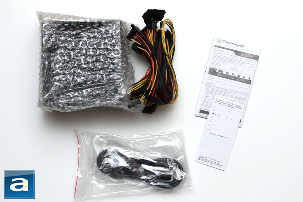 The Thermaltake SMART 630W's packaging is intrinsically simple. When they said "no gimmicks", they were not kidding, haha. After opening the flap top box, what you will get is Thermaltake SMART 630W power supply itself, one AC power cord, four screws, and two pieces of documentation. That's it. No zip ties, no Velcro straps, nothing -- just everything you would expect from a power supply intended for people on a limited budget.