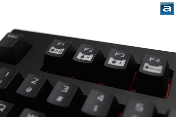 As seen in the picture above, all the function keys have different purposes, which can be activated by pressing the FN key. Once pressed, the FN key will light up and stay locked, unleashing the secondary function of the F1-F12 array. The CM Storm QuickFire Pro features a partial red backlight rather than full backlighting. By using F1 to F4, the user can turn on and off the partial backlight, adjust its brightness, and cycle through three illumination modes. The three modes of the backlight include Gaming Cluster, Extended Gaming Cluster, and Extended Gaming Cluster (breathing). The “Gaming Cluster” mode turns on the backlight of the WASD and the arrow keys. “Extended Gaming Cluster” adds even more commonly used keys, such as the Esc buttons, buttons around WASD, and the space bar. Finally, the breathing mode of the extended gaming cluster allows the keyboard to “breathe” by fading in and out. In addition to all this, the CM Storm logo on the top right of the keyboard glows bright red when any backlight mode is activated. While almost useless, this looks awesome while typing in a room of darkness. I would prefer a full backlight for everyday users, even though this keyboard is geared towards gamers. Speaking of lights, in the top right corner are three dedicated LEDs allowing for the user to know when Num, Caps, and Scroll Lock is activated. From F5 to F11, the secondary function keys allow for adjustment of media options. This includes the standard Play/Pause, Stop, Previous, Next, Mute, and Volume Down/Up. Upon testing the media keys, I found all of them to be quite responsive, and worked perfectly with Windows Media Player. Adjusting Volume Up and Down adjusts the output in increments of two. Finally, the secondary function of F12 is “Windows Key Lock” mode, which disables the Windows key so that there will be no tears or anger due to a death by minimize.