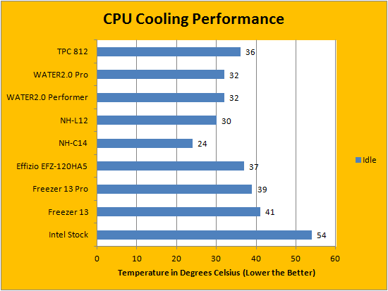 The Cooler Master TPC 812's performance was pretty disappointing when our Intel processor is put under load. Taking the highest CPU core reading in AIDA64 Extreme Engineer, the TPC 812 ended up third from last place -- barely edging out the stock cooler and the silence oriented SilenX Effizio EFZ-120HA5. Yes, Hyper Threading is enabled. How can something with so many heatpipes -- along with the heavily advertised Vertical Vapor Chamber -- perform so poorly in real life? To investigate this problem, I swapped out the intake fan with a Noctua NF-F12 PWM, and added a NF-P12 PWM at the back. From here, the performance is significantly improved. While the Cooler Master TPC 812 is very capable of transferring heat from the CPU to the fins, the single fan configuration is not capable of exhausting the air quick enough. A push-pull configuration will easily propel the TPC 812 near the top.