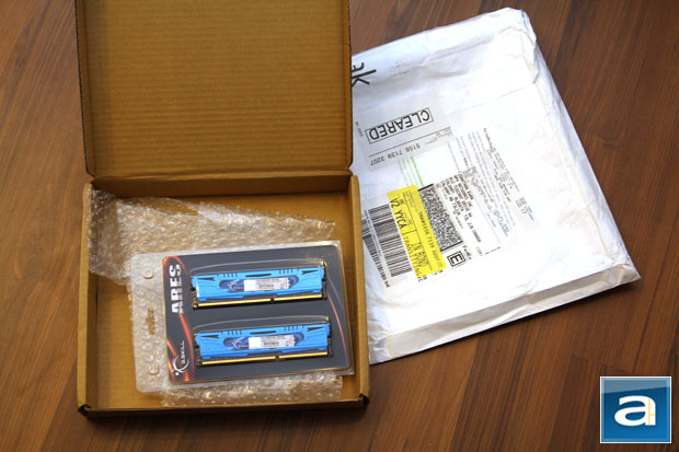 Our review unit of the G.Skill Ares F3-1600C8Q-16GAB 4x4GB did not come in a Trojan Horse, but rather, a plain FedEx Pak from the company's headquarters in Taiwan using the International Economy service. The lack of a bubble envelope is nothing to get alarmed over, as the people preparing the shipment slipped a corrugated cardboard box inside the envelope -- along with some, you've guessed it -- bubble wrap for protection. As such, everything arrived to us here in Calgary, Alberta, Canada in excellent condition for our review today. We cracked open the box, fired up my camera, and got straight to work.