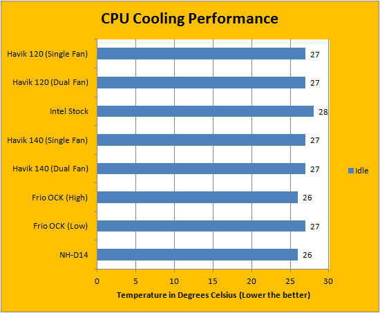 The idle tests should not come as much of a surprise, as the Intel Core i7-2600K does not generate a significant amount of heat when idling. Performance was identical to the HAVIK 140 for these tests, and the amount of noise generated was also very comparable. While the Frio OCK and NH-D14 both performed better, they are significantly larger, and this is to be expected. However, the 120mm fans do not appear to make this cooler perform as horribly as the Intel stock cooler, but honestly, no aftermarket cooler should ever perform at that level.