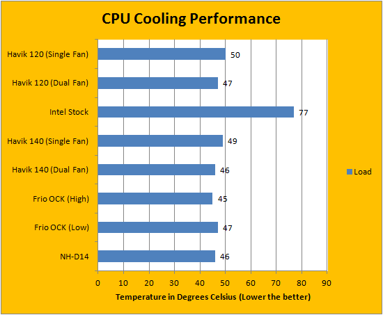 Well as exciting as the idle tests can be, the load tests show a very interesting story. The NZXT HAVIK 120 performed almost identically as the HAVIK 140. In fact, the difference of a mere degree seems rather impressive. because of the more compact physical and smaller fans. This cooler did clearly run warmer than all the other coolers; although it is significantly smaller and cheaper. The results are not surprising, but it goes to show how size can actually make a minor difference when it comes to performance.
