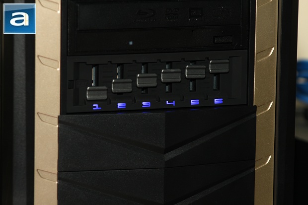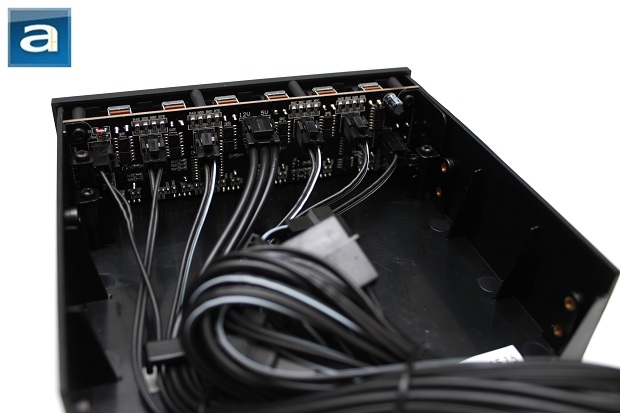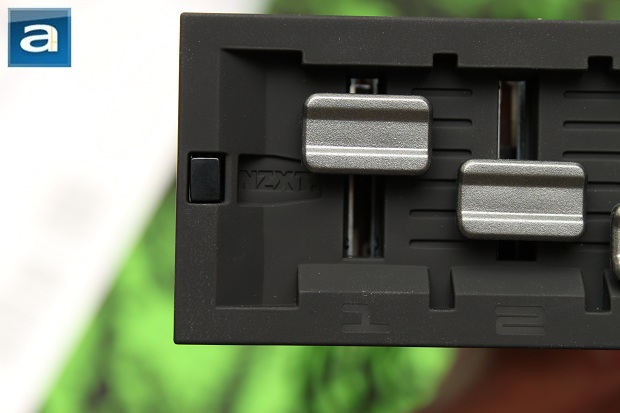 With that aside, on the topic of the slider controls, there is a total of six, as shown in the photo above -- one for each channel; labeled 1 through 6 from left to right. These numbers light up in the dark, so if you ever decide to work on your computer when the light's out, this is a nice feature to have to show off to your geeky friends. Whatever your favorite color may be, you are limited to a choice of five in this particular case: Red, blue, green, purple, or white. If none of these suit your taste, you can always turn the backlight off via the small rectangular button on the left side, next to the well hidden NZXT logo. The button is also where you would be looking if you decide on changing the color to suit your preference. One thing to note here is that if you have your fans plugged in, they will always be running at a minimum of 40% load. For those quiet enthusiasts out there, you will have to deal with this. It would have been nice if NZXT provided an option to turn off your fans completely. Although that may not be always be a good idea, sometimes, you just aren't running a full load, so flicking them off completely will reduce the ambient noise.