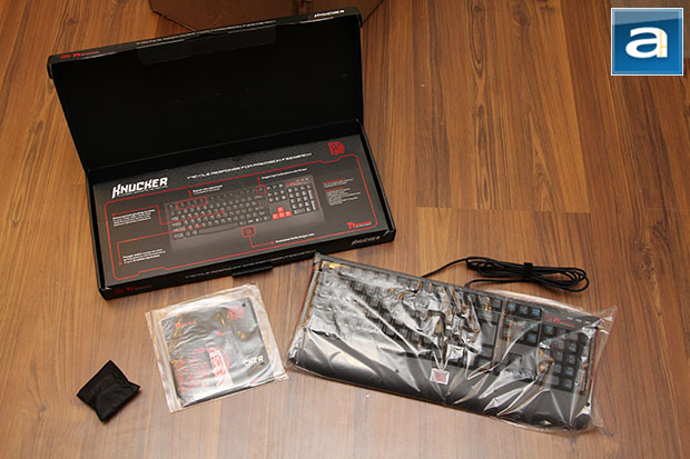 Flip open the flap top box, and you will be greeted by a cover going over the feature highlights of this keyboard. In other words, upon opening the box, you will see a picture of the Knucker before seeing the Knucker itself. Beneath the internal flap is none other than the keyboard itself; also included is a bag containing eight keycaps and a key remover, instruction manual, warranty policy guide, and a Tt eSPORTS battle dragon sticker. Notably missing is the driver software disc. The reason is simple: The Tt eSPORTS Knucker is a pure plug and play solution with no requirement for third party drivers. Whew, it has been a long time since I have used anything like this before.