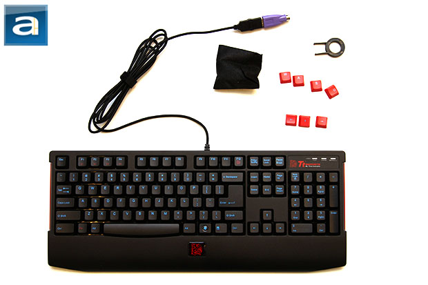 As aforementioned, the Thermaltake Tt eSPORTS Knucker is a fine example of a traditional no-frills keyboard, so I am not going to spend too much time talking about its layout -- if you have typed on any keyboard before, then this is just the same old, same old. What I do want to talk about is its unique aspects, such as the removable keycaps. Its standard WASD and arrow keys can be easily taken out by the included removal tool, in which we have seen in my colleague Jeremy's Challenger Pro review a couple of years ago. A set of red caps are included for visual distinguishment; FPS and other gamers will definitely appreciate this feature.