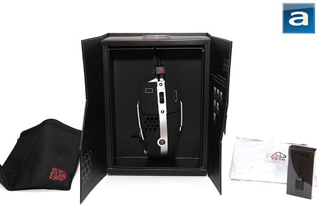 What you have seen above is just the wrapping, because the real stuff is stored inside another box, which can be slid out from the top or the bottom. Opening two sophisticated looking doors with cool slogans reveals the mouse, leaving a strong first impression that seems to speak to you quietly, "Behold, your Tt eSPORTS Level 10 M." The black colored tray makes the mouse feel like an expensive boutique product, and to be fair, even though it is not going to be from a boutique store (Unless you count Newegg as one), a hundred bucks is still some moolah for the working man. Other than that, not a whole lot is included out of the box, which is cool. A soft, high quality drawstring pouch is provided to carry your mouse. It is even separated into two internal compartments to keep the mouse cable organized. Meanwhile, a key is included so you can adjust the mouse's "3D Steering" angle -- more on this later. Of course, the usual manual and stuff is included, but I never bothered to open it.