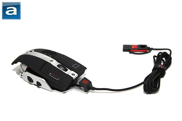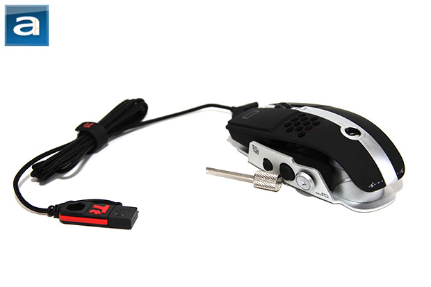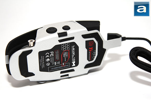 With this in mind, the Level 10 M designed in collaboration with BMW DesignworksUSA has quite unique physical attributes, besides what that meets the eye. The hollow center with ventilated sides and partial honeycomb grille at the top keeps your sweaty palms from infesting the surface of the mouse; a smooth industrial grade rubber coating overlays the black portions of the mouse to maximize friction between your skin and the surface. A backlit Tt eSPORTS logo glows directly behind the honeycomb grille at the top, constantly pulsating in a cycle of permanently fade-in/fade out routine to let you know of its presence. A continuous aluminum surface wraps around the bottom up to the left and right sides of the Level 10 M for its lightweight characteristics. As you can see in our photo above, a hex key is included to adjust the height and the front/back displacement of the top -- cool. This can be done by two screws located on the Level 10 M, with one located at the top and one located on the right side of the unit. This definitely comes in handy depending on the size of the user's hand. Unfortunately, the 185g weight of Tt eSPORTS' flagship pointing device is not adjustable, so you will need to deal with whatever Thermaltake thinks is the best for you if this ends up on your desk.
