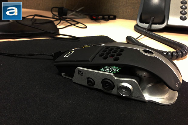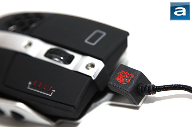... and here they are. Once again, do not be twitchy -- otherwise you will start do something weird in game, depending on your programmed macro or function. It will cost you, and you have been warned. Traditionally, if you design a human interface peripheral, you would like to keep auxiliary buttons from easily pressed. Anyone who has typed a long forum post and accidentally hit the 'back' button would know how annoying this could get. You may argue that you can disable the buttons, but what is the point then? Complaints aside, as you can see in our photo above, here you can see more clearly the set of indicators LED on both mouse buttons. On the left, a rectangle lives near the edge to let the user know which one is which. LAN party goers will definitely appreciate this touch. On the right, an array of four LEDs -- with a '1' at the top of the array, and a '4' at the bottom -- shows the active sensitivity level. This also implicitly lets you know the location of the right mouse button. The wheel is translucent with a black rubber grip at the top, and is also backlit for easy visual identification. Only the sensitivity LED array backlight is permanently red; the rest will change color in accordance to the one corresponding to the current active profile.