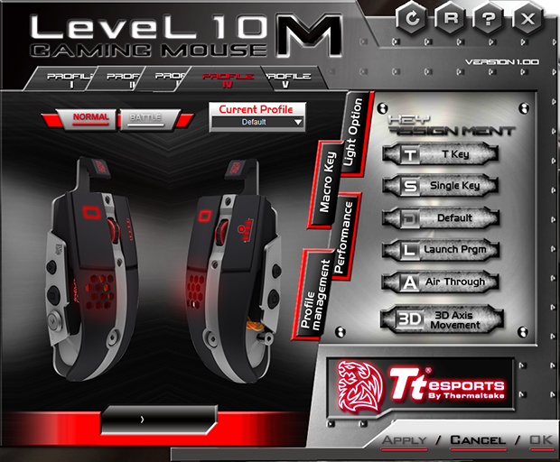 The Tt eSPORTS Level 10 M's configuration software design is true to the product line. Retaining a fundamentally similar design theme than other Thermaltake mice we have used in the past, once again, do not expect that office look; this is all gaming. Yes, it does look a bit tacky, but hey, we all appreciate different things, right? Personally, I found the GUI to be a bit confusing at first, but once you get the hang of it, usage is quite straightforward. First, select the profile you would like to modify. Click on the corresponding buttons on the photo of the Level 10 M to modify key assignments by using menu options on the right. Selecting "Air Through" and "3D Axis Movement" will bring up a video demonstrating the respective features. If you want to modify features such as its glow color or sensitivity (Including independent X/Y axis speed), those options are in the buttons located in the middle. And of course, you are always free to set your own macros. Generally speaking, just click around until you find what you need, it is not going to take too long.