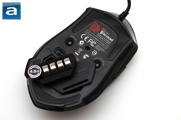 Flipping the Tt eSPORTS Theron over, you will see it is made out of mostly plastic. The front and back end of the mouse has Teflon feet, which are commonly used on many gaming mice. Teflon is an excellent material, because it enhances glide and smoothness of your mouse over different surfaces. Based on previous experiences, these feet should give you quite a long time before wearing down, so durability over time should be of little concern. As well, you will find LED lighting strips running along the side and heel edges of the mouse. This gives a glowing effect around your mouse on the surface you're using it on. The optical sensor, located approximately in the center of the mouse, is based on the Thermaltake's very own Tt Pro Grade (T.P.G.) 5600 dpi laser engine, capable of up to 5600 dpi sensitivity with supported polling rates of up to 1000Hz at 1 ms response time. This is the industry performance standard, meaning it can send up to one thousand pieces of tracking data per second to your computer, increasing mousing precision. You will also notice there are two buttons here -- one for changing between five different profiles, and the other for adjusting the polling rate. As well, you will have access to its set of weights already pre-installed, each weighing 4.5g for a total of 22.5g over five units. They can be easily accessed at the underside of the mouse by simply removing the cover that keeps them secured in place. The cover has a somewhat flexible section for users to unlatch the inner hook, which keeps the cover in its place. The Theron also houses a rubber tray to keep the weights secured down in proper order so it does not bounce around. Of course, if you prefer having no weights at all, you can simply remove the whole container at your discretion.